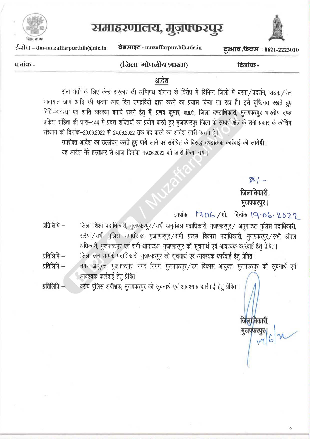 मुजफ्फरपुर डीएम प्रणव कुमार ने जिले के सभी कोचिंग संस्थान को 20 से 24 जून तक बंद रखने का आदेश जारी किया है। Dm ने केंद्र सरकार की अग्निपथ योजना को लेकर हो रहे उपद्रवियों द्वारा किए जा रहे बवाल के मद्देनजर यह फैसला लिया है।