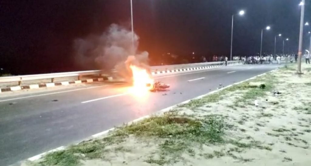 राजधानी के नए बने गंगा पाथ-वे पर सोमवार शाम एक्सीडेंट हो गया है। बाइक के धक्के से 40 साल की एक महिला की मौत हो गई। इसके बाद गंगा पाथवे पर अफरा-तफरी मच गई। मौके पर ही बाइक चलाने वाले और पीछे बैठे उसके साथी को लोगों की भीड़ ने पकड़ लिया। दोनों की जमकर पिटाई की। लाठी-डंडे के साथ ही लोहे के रड से इन्हें बुरी तरह से पीटा। उग्र लोगों ने इनकी बाइक में आग लगा दी। धक्का मारने वाले युवक और उसके दोस्त की जान तब बची, जब दीघा थाना की पुलिस वहां पहुंची। फिलहाल दोनों युवक पुलिस की कस्टडी में हैं।