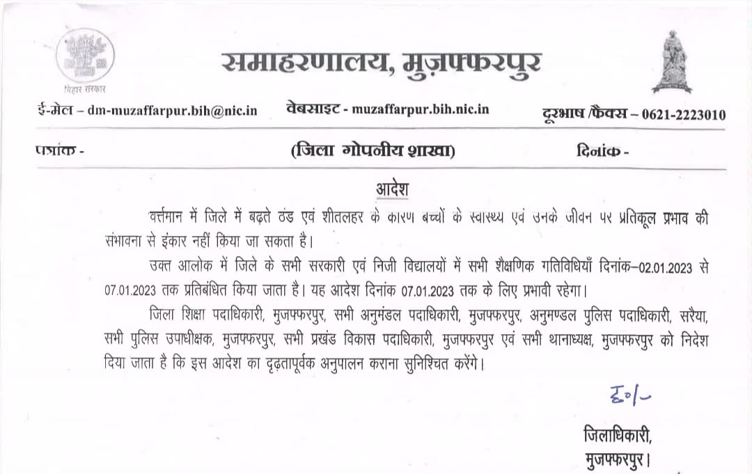 बता दें कि मुजफ्फरपुर में ठंड का प्रकोप काफी बढ़ गया है। दिन में धूप नहीं होने से जनजीवन अस्त व्यस्त हो गया है। इसी कारण और बच्चों के सेहत को ध्यान में रखते हुए उक्त आदेश जारी किया गया है।