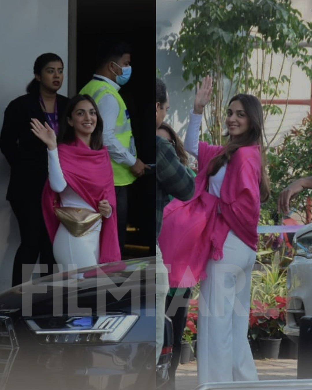 शादी के लिए जैसलमेर पहुंची कियारा एयरपोर्ट पर स्पोर्टी लुक में नजर आई. कियारा सफेद कलर के जंपसूट में बेदह ही खूबसूरत नजर आईं, जिसके साथ उन्होंने पिंक कलर का शॉल भी कैरी किया था.