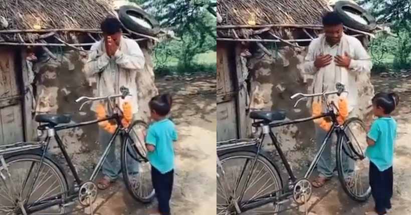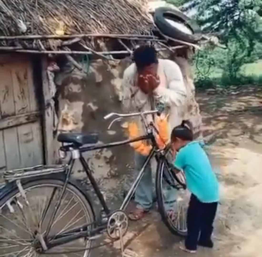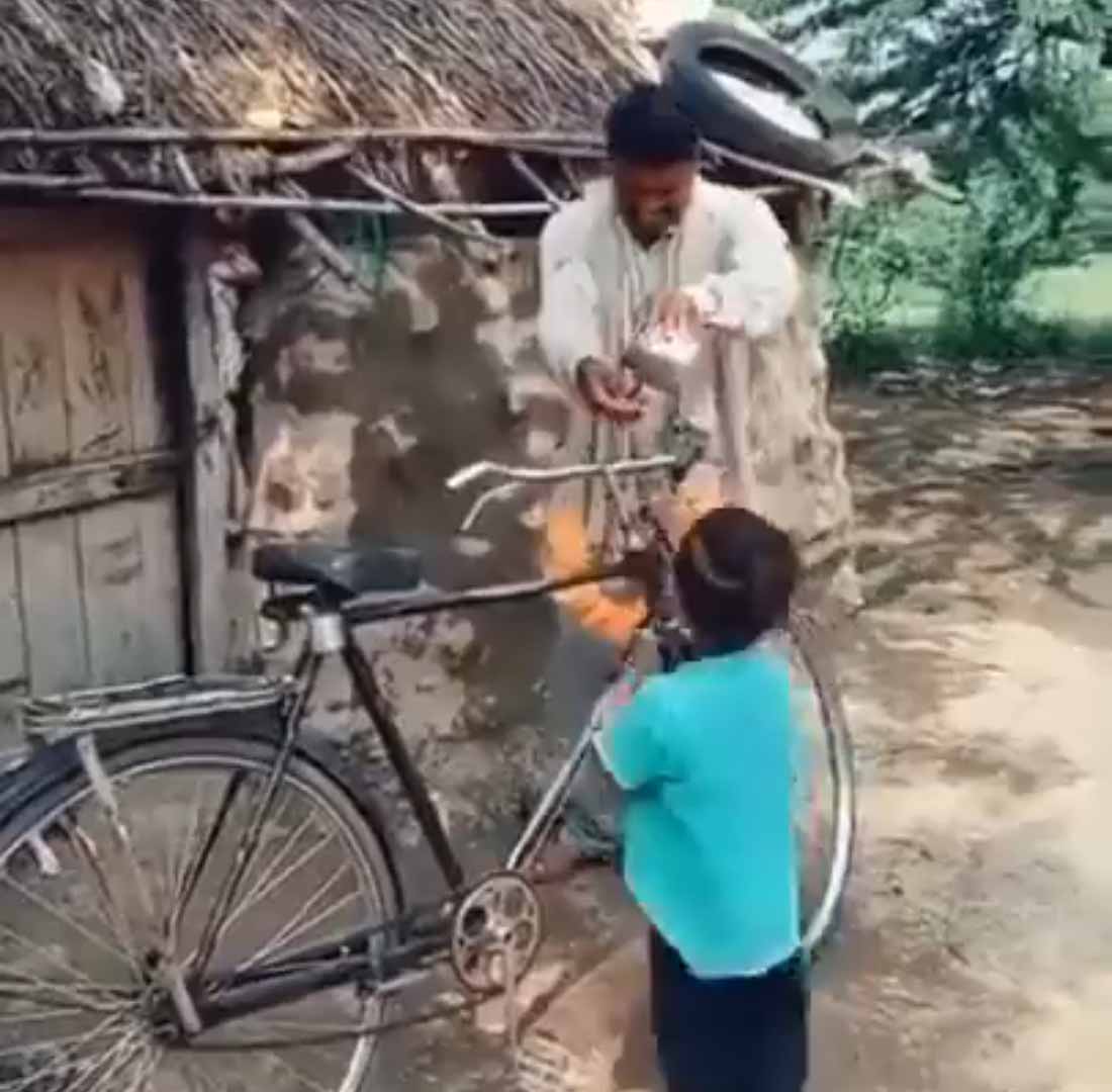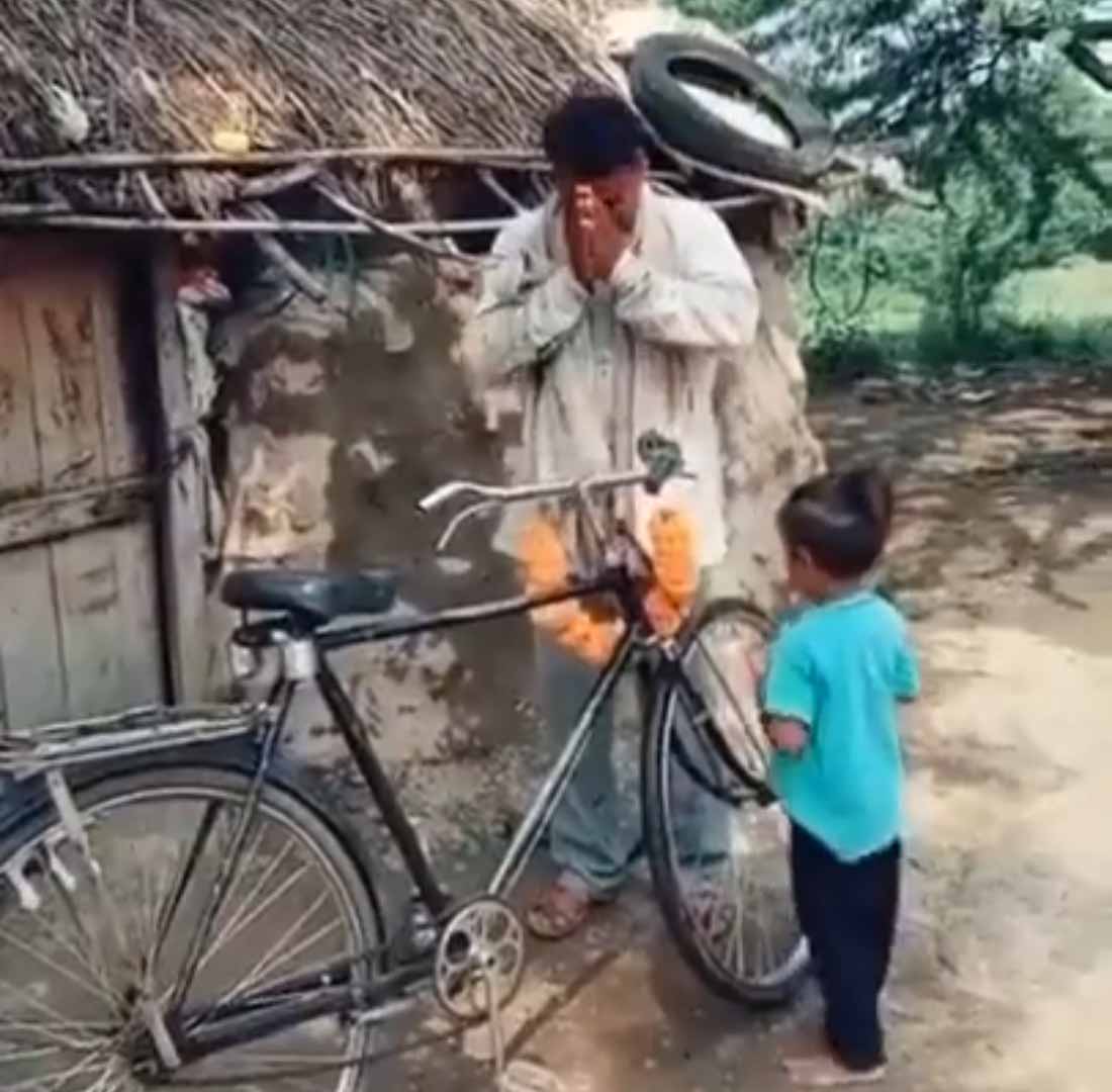 वायरल हो रहे वीडियो में आप देख सकते हैं कि कैसे एक शख्स कच्चे घर के सामने खड़ा है। वो एक पुरानी साइकल पर फूलों की माला डालकर और उस पर जल छोड़ता है। उसकी पूजा करता दिख रहा है। वहीं दूसरी तरफ एक बच्चा खुशी से उछल रहा होता है। वह लगातार खुशी से उछलता रहता है और ताली बजाता है।