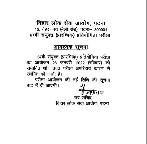 बिहार लोक सेवा आयोग ने 67वीं संयुक्त (प्रारम्भिक) प्रतियोगिता परीक्षा स्थगित कर दी है। BPSC का कहना है कि परीक्षा अपरिहार्य कारणों से स्थगित गई है। परीक्षा आयोजन की नई तिथि की सूचना बाद में दी जाएगी। BPSC की ओर से मंगलवार को जारी नोटिस जारी में यह बताया गया है कि यह परीक्षा 23 जनवरी 2022, दिन रविवार को प्रस्तावित थी, लेकिन इसे अगले आदेश तक के लिए स्थगित कर दिया गया।