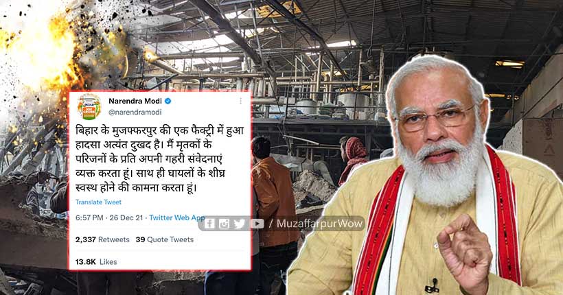 प्रधानमंत्री नरेन्द्र मोदी ने मुजफ्फरपुर हादसे पर दुख जताया है.मोदी ने ट्वीट करके मृतकों को घटना के प्रति गहरी संवेदना जताई है।अपने ट्वीट में मोदी ने लिखा है कि बिहार के मुजफ्परपुर की एक फैक्ट्री में हुआ हादसा अत्यन्त दुखद है.में मृतकों के परिजन के प्रतिअपनी गहरी संवेदनाएं व्यक्ति करती हूं.साथ ही घायलों के शीघ्र स्वस्थ होने की कामना करता हूं.