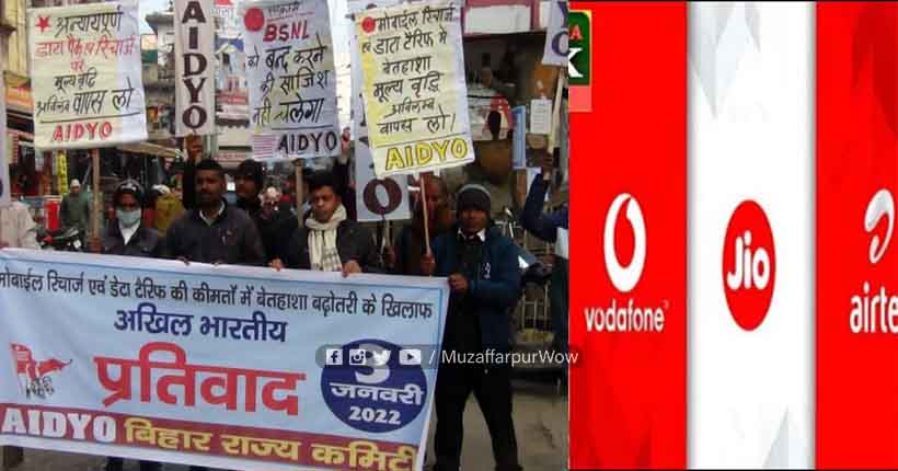मुजफ्फरपुर में सोमवार को मोबाइल रिचार्ज एवं डाटा टैरिफ के बढ़ती कीमतों के खिलाफ AIDYO (ऑल इंडिया डेमोक्रेटिक यूथ ऑर्गेनाइजेशन) ने अखिल भारतीय प्रतिवाद बिहार राज्य कमेटी के बैनर तले मुजफ्फरपुर में जमकर प्रदर्शन किया गया। संगठन के पूर्व सचिव मंडल सदस्य तमाल सामंत एवं वर्तमान अखिल भारतीय ऑफिस सेक्रेट्री विजय मल्लिक के नेतृत्व में जुलूस निकाला गया। संगठन के जिला कार्यालय मोतीझील से कार्यकर्ताओं ने इंकलाब जिंदाबाद के नारे भी लगाए।
