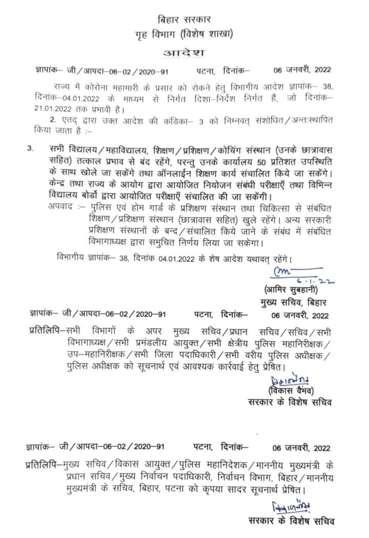 बिहार में कोरोना संक्रमण को देखते हुए बिहार सरकार ने सभी स्कूल-कॉलेज एवं कोचिंग संस्थान को बंद करने के आदेश दिये हैं. 21 जनवरी तक सभी शिक्षण संस्थान बंद रहेंगे। वहीं ऑफिस 50 फीसदी उपस्थिति के साथ खुलेंगे.
