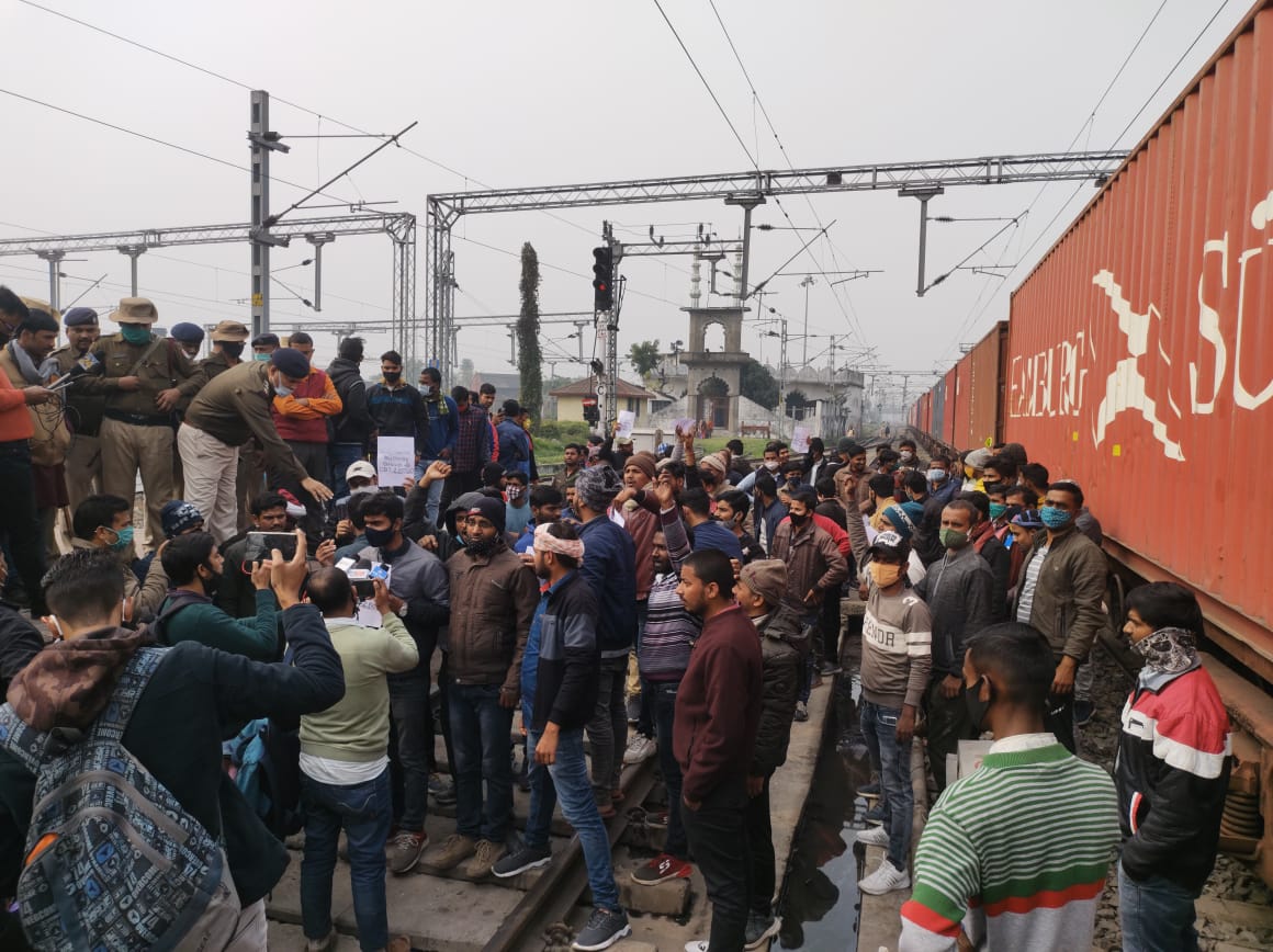मौके पर भारी संख्या में RPF और GRP के पुलिस बल तैनात किया गया है जो छात्रों को समझाने बुझाने में लगे हुए है। आक्रोशित छात्र रेल मंत्री और केंद्र सरकार के खिलाफ में जमकर नारेबाजी कर रहे है और रेलवे ट्रैक पर बैठ गए है।