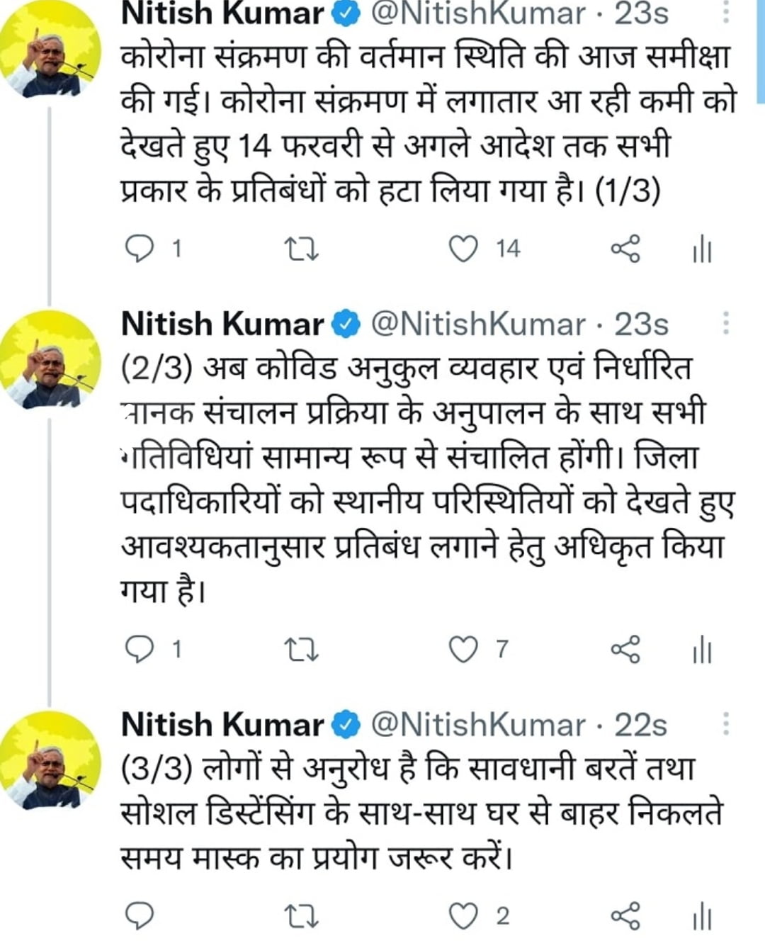 CM नीतीश कुमार ने आज शाम सोशल मीडिया पर यह जानकारी दी है। हालांकि उन्होंने कहा है कि इस दौरान कोरोना प्रोटोकॉल का पालन करना होगा। मास्क, पब्लिक प्लेस में सोशल डिस्टेंसिंग और सैनिटाइजर का उपयोग जारी रहेगा।
