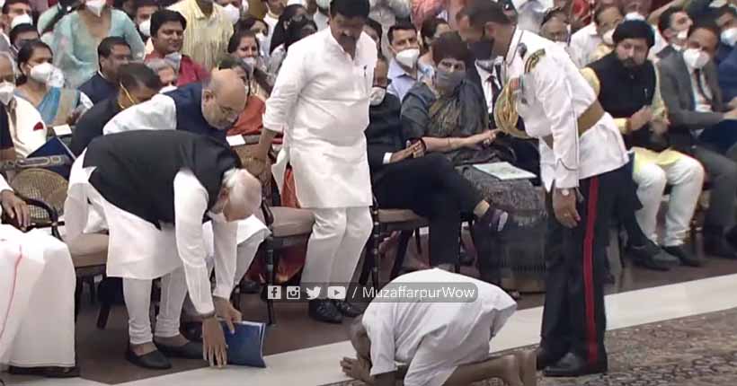 योग गुरु सम्मान लेने के लिए पहुंचे तो वह प्रधानमंत्री नरेंद्र मोदी के आगे घुटनों के बल बैठकर उनका अभिवादन करने लगे. योग गुरु को ऐसा करता देख प्रधानमंत्री मोदी तुरंत अपनी जगह पर खड़े हो गए और झुककर दोनों हाथ जोड़कर योग गुरु के सामने नतमस्तक हो गए. योग गुरु ने इसी अंदाज में राष्ट्रपति का भी अभिवादन किया.